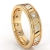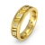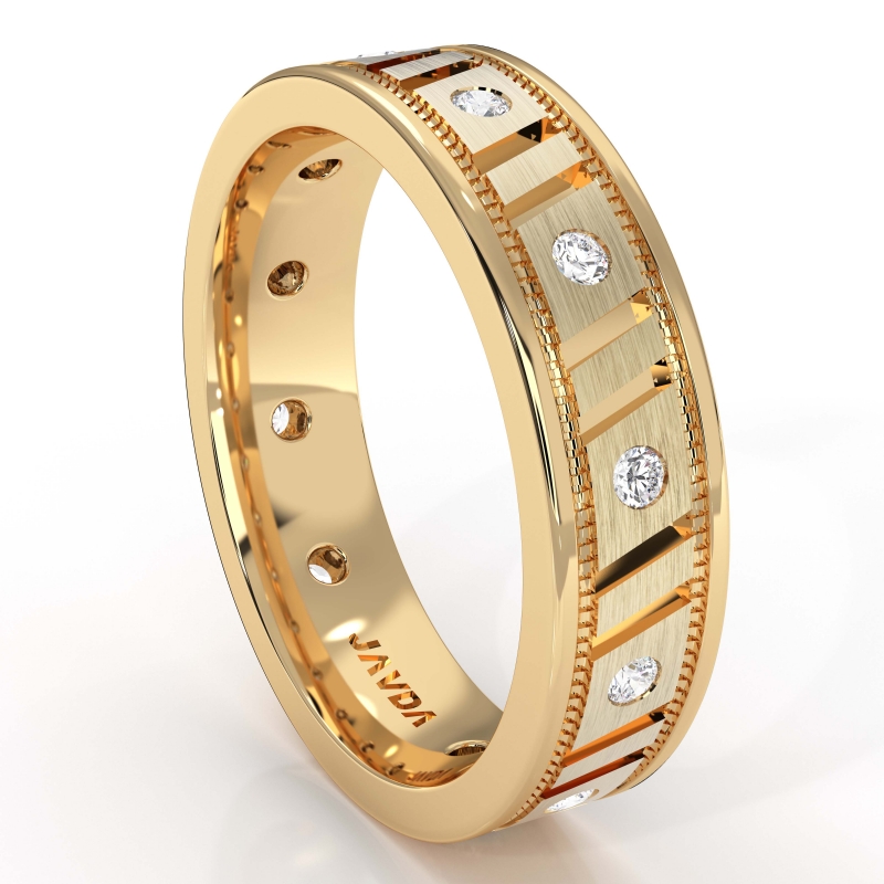This handsome comfort fit men's diamond carved eternity wedding band made from 14k Gold Yellow. Featuring parallel vertical groove and milgrain edges with round diamond in a bezel setting.