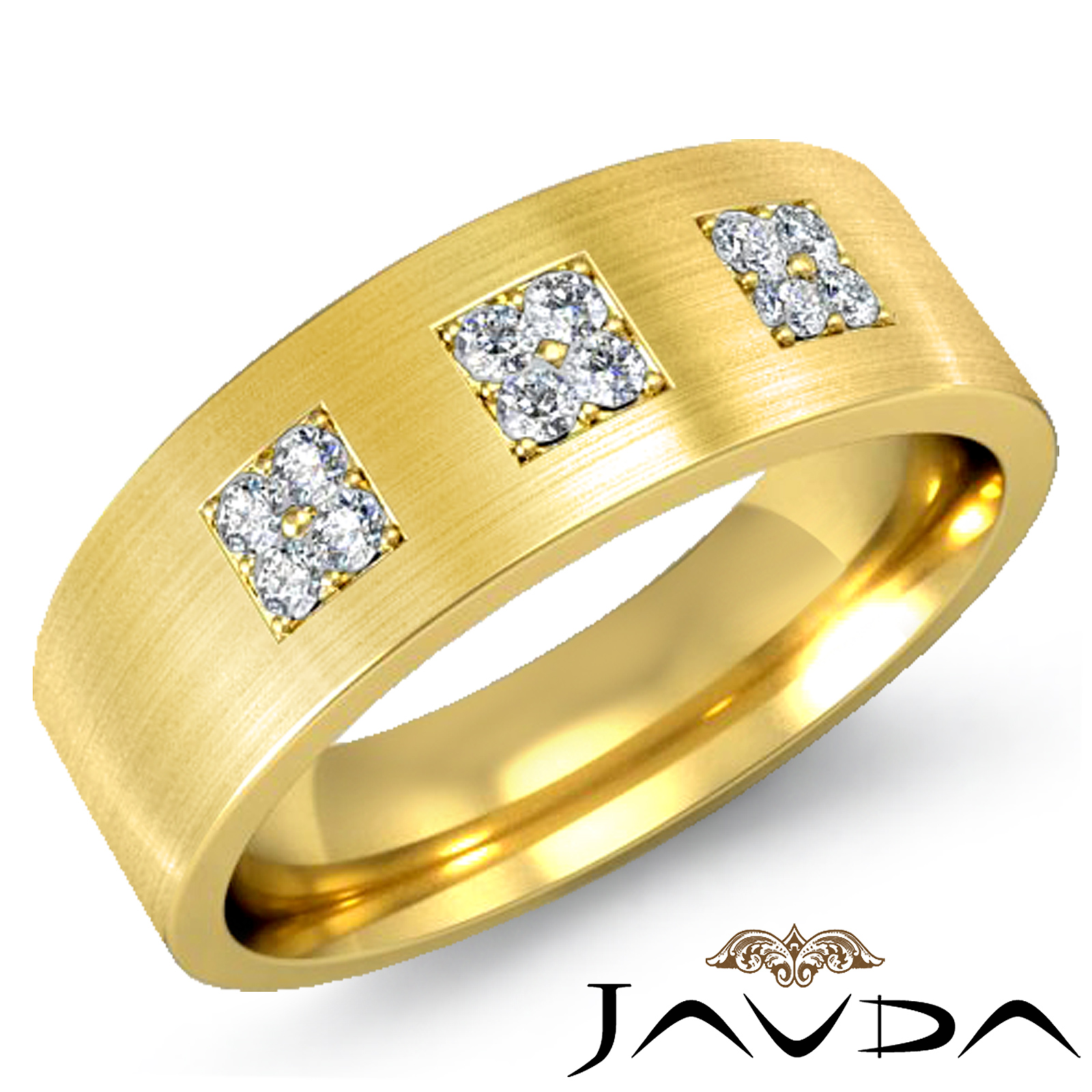 Classic & durable matte finish 3 square set round diamond men's half wedding band is made from solid 14k Gold Yellow. Featuring matte finish band with pave round diamonds beautifully set in a square.