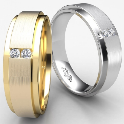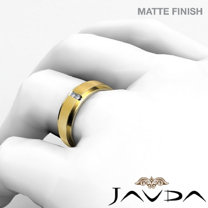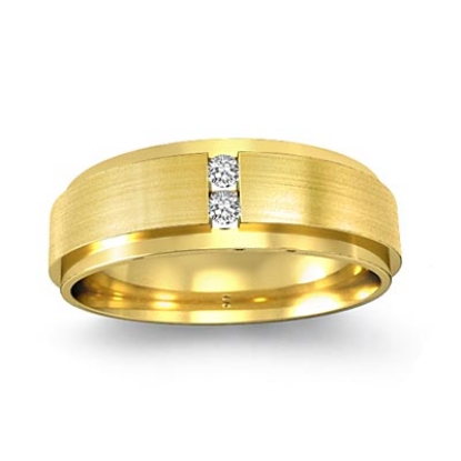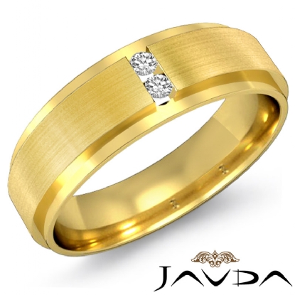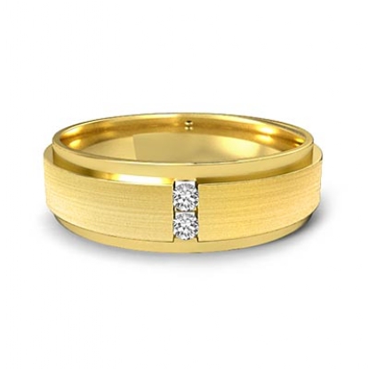 The matte finish 2 diamond men's half wedding band is made from 14k Gold Yellow. This wedding ring showcasing polished flat edge and matte finished center with round cut channel set diamonds.