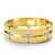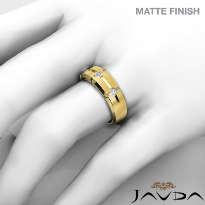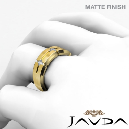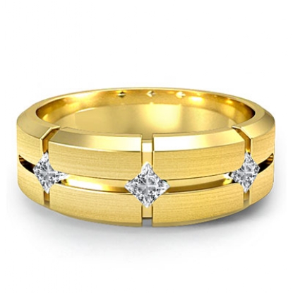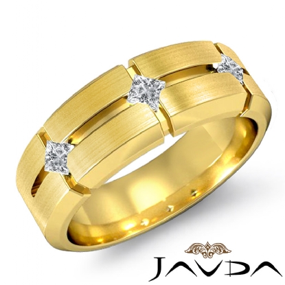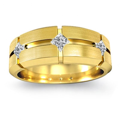 An eye catching unique matte finish 3 stone princess diamond men's half wedding band is made from 14k Gold Yellow. Showcasing matte finished with vertical & horizontal cuts and princess diamonds in a bezel setting.