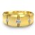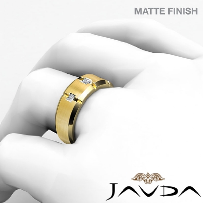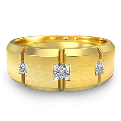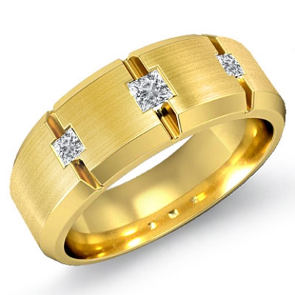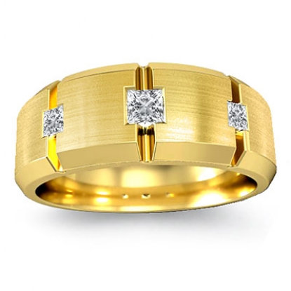 Stunning luxurious bezel 3 stone diamond bevel edge men's half wedding band crafted in 14k Gold Yellow. This sophisticated wedding ring features polished beveled edges and matte finish center with three princess cut bezel diamonds set on grooved.