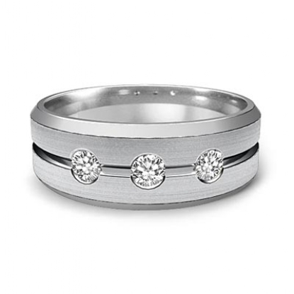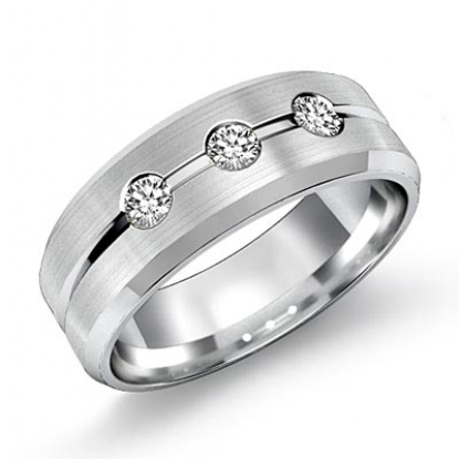 An eye-catching classic 3 stone diamond men's half wedding band is made from solid 14k white gold. Featuring polished beveled edges and matte finished center grooved with 0.30 carat round 3 stone diamonds in a bezel setting.