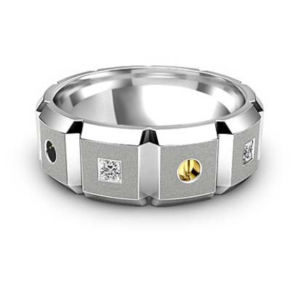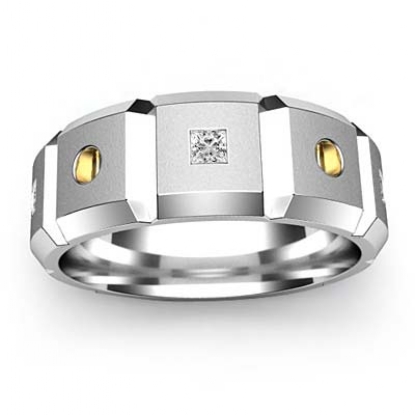 This unique and stunning diamond eternity men's wedding band is made from 14k two tone gold. Showcasing polished beveled edges and matte finish center with 0.35 carat 5 princess cut diamonds set in a bezel setting.