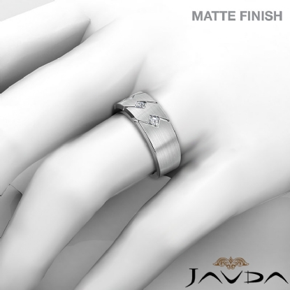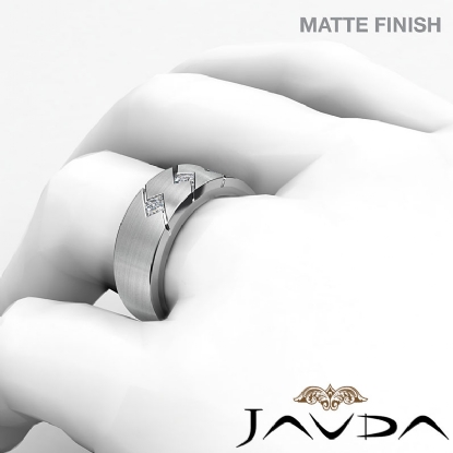 Classic and durable men's diamond half wedding band is made from quality 14k white gold. Featuring this matte finish ring with 0.35 carat bezel set princess cut diamonds on diagonal cuts.