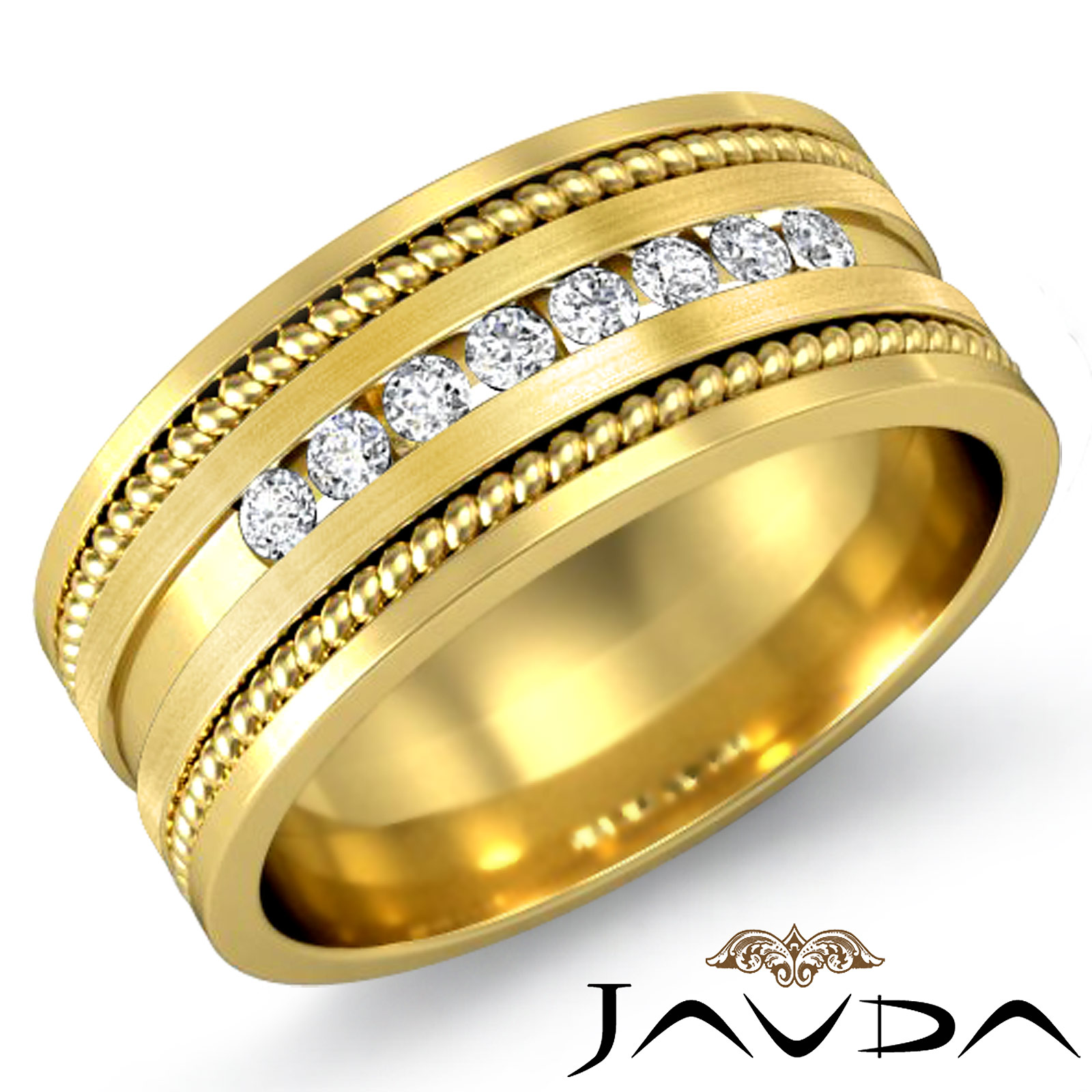 An elegant and stylish diamond men's wedding band made from solid 14k Gold Yellow. This wedding ring features round cut diamond in a channel setting and rope edges.