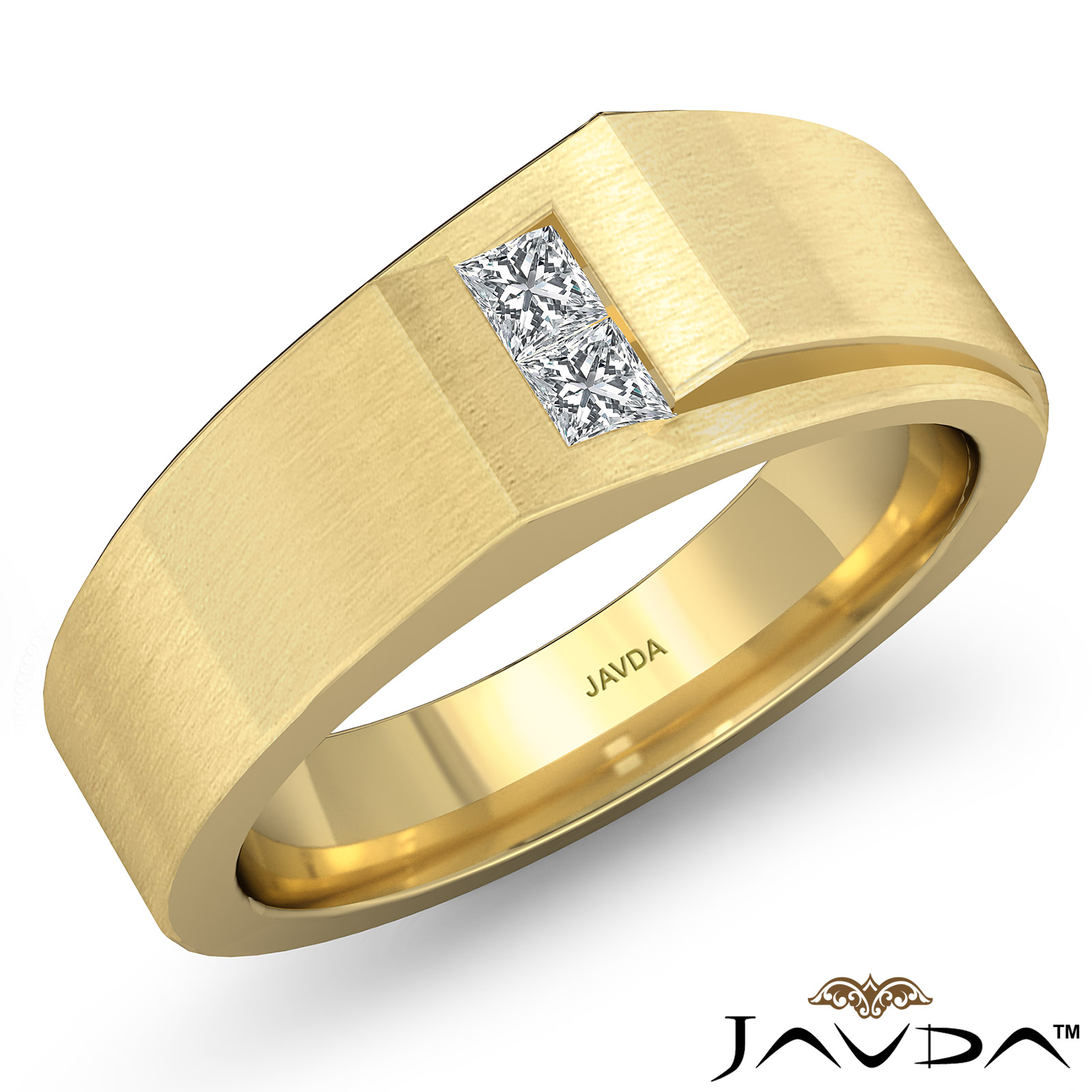 A beautiful pointed matte finish diamond men's half wedding band is made from solid 18k Gold Yellow. Showcasing matte finish band with princess diamonds set in a channel setting.