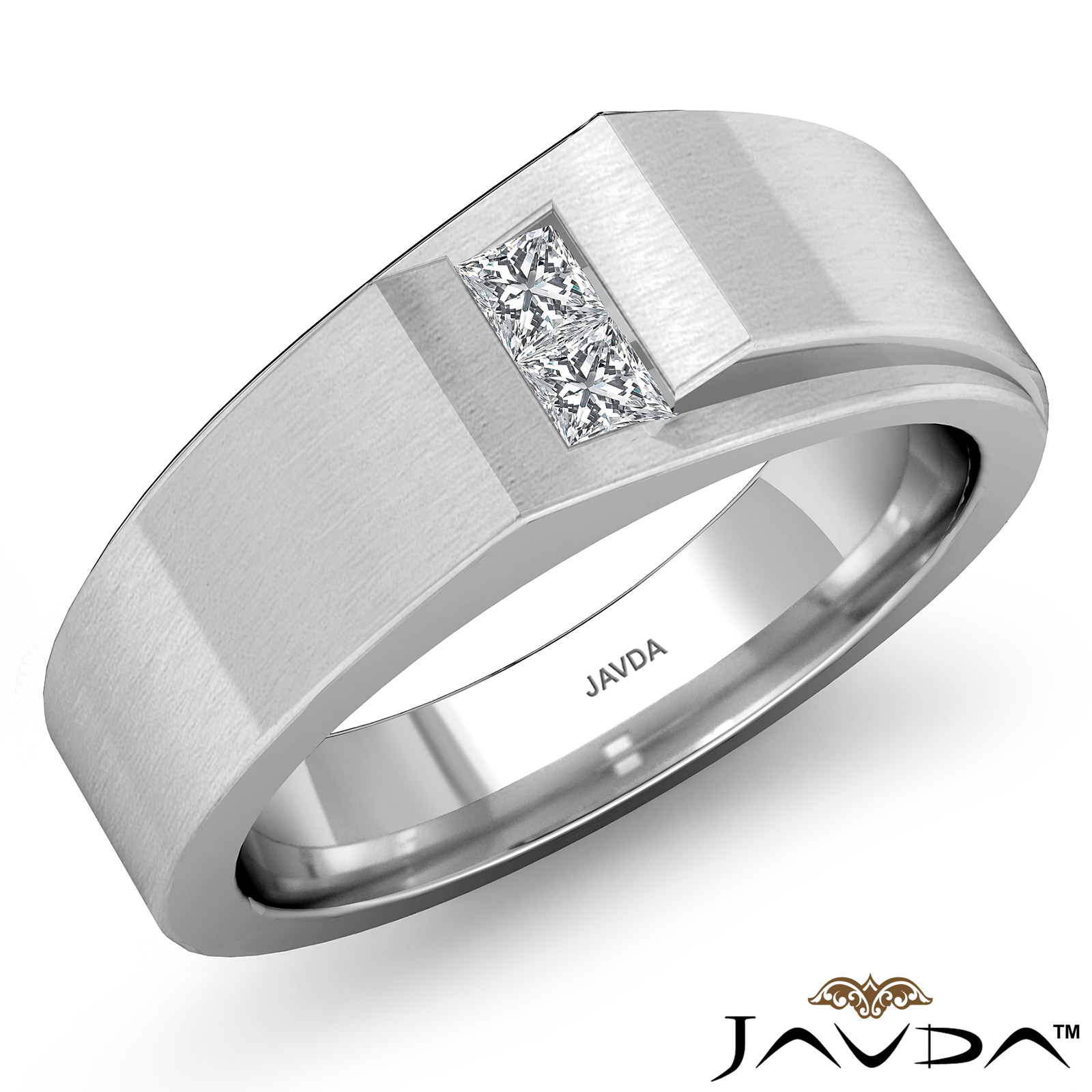 A beautiful pointed matte finish diamond men's half wedding band is made from solid Platinum 950. Showcasing matte finish band with princess diamonds set in a channel setting.