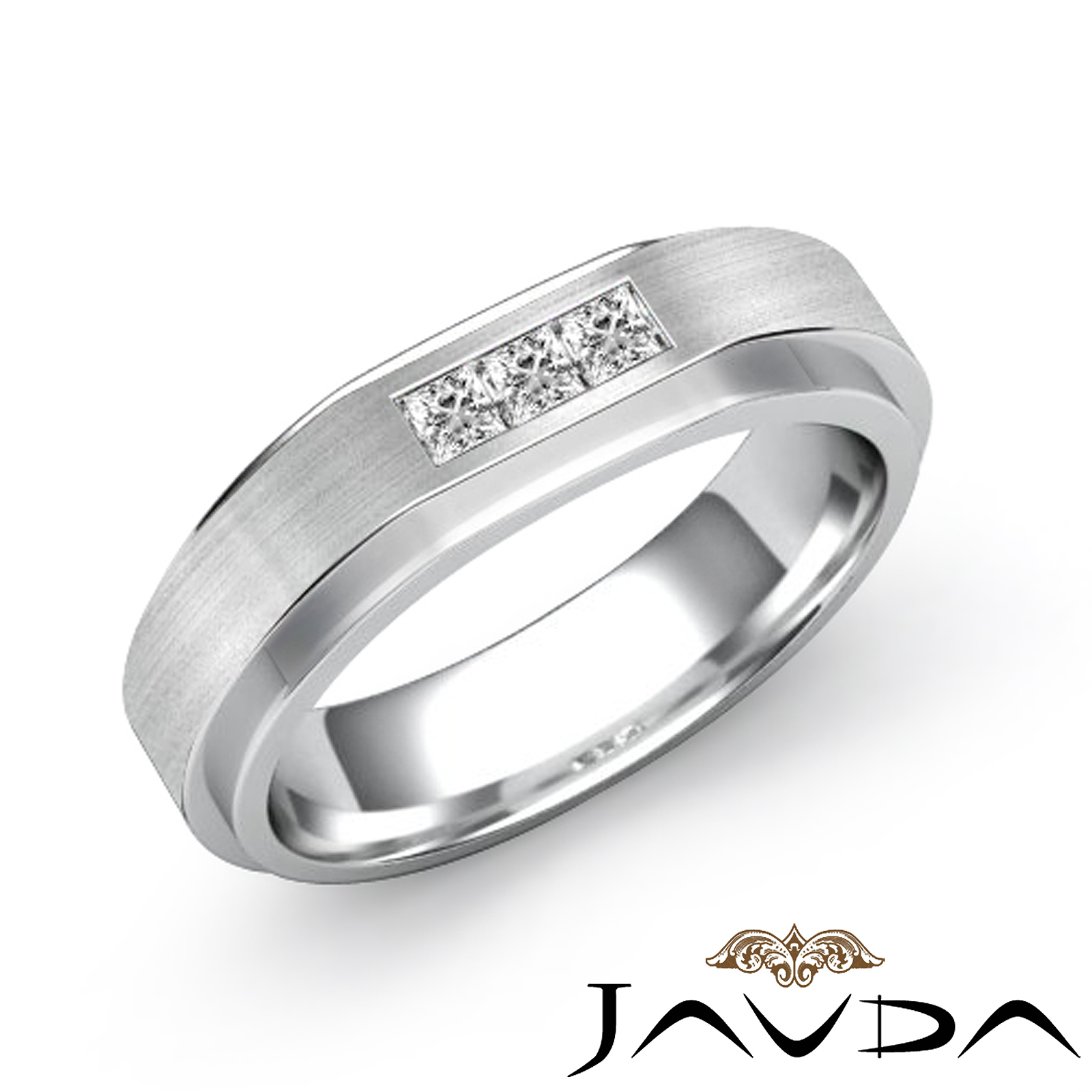 A classic handsome diamond men's half wedding band is made from solid 14k white gold. Featuring polished flat edge and matte finish center with 0.35 carat 3 stone princess cut diamond in a channel set.