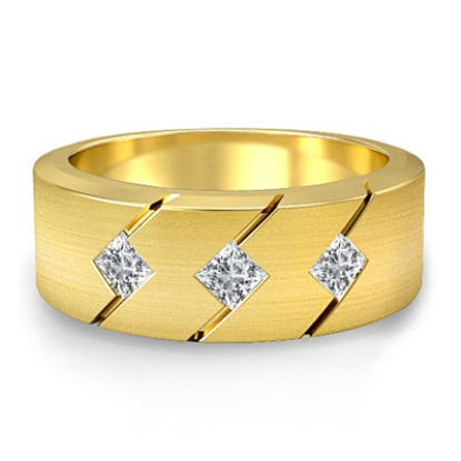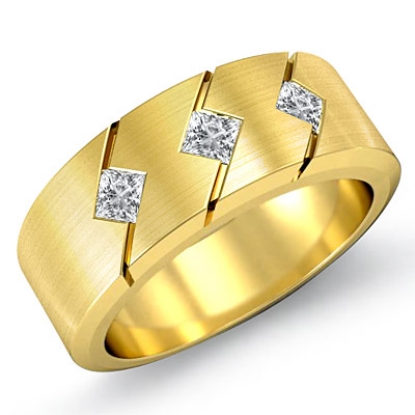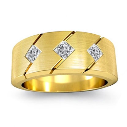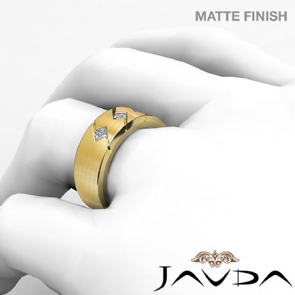 Classic and durable men's diamond half wedding band is made from quality 14k Gold Yellow. Featuring this matte finish ring with bezel set princess cut diamonds on diagonal cuts.