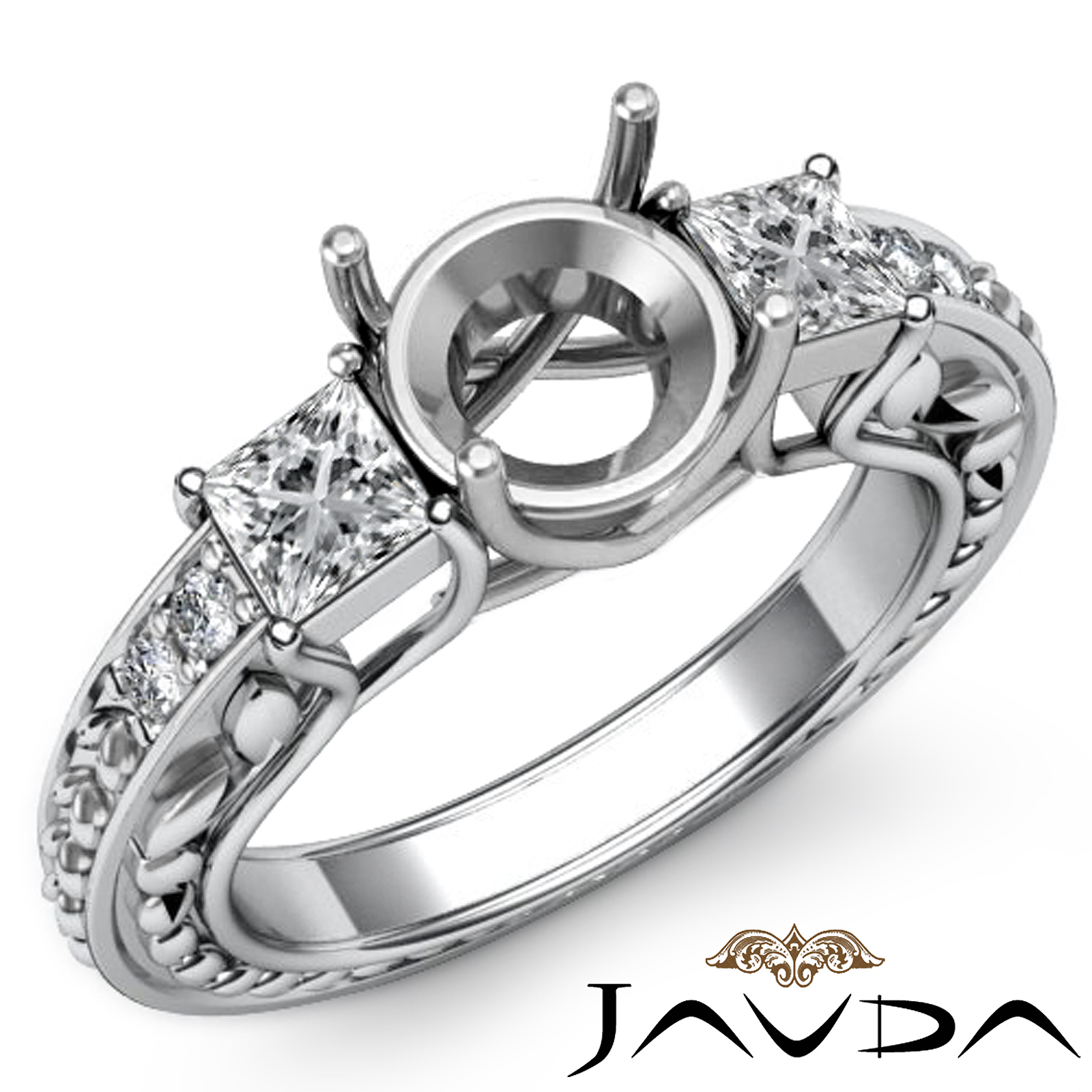 Delicately set round diamond semi mount and princess cut side stones in prong setting, this three stone ring looks ecstatic. Smaller round diamonds and leaf motifs highlight the ring. This 0.40ct. ring is made in 14K white gold.