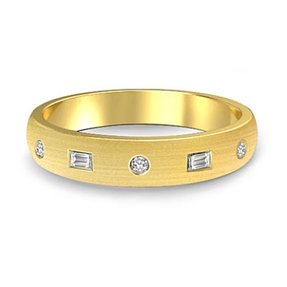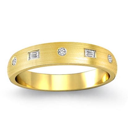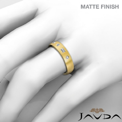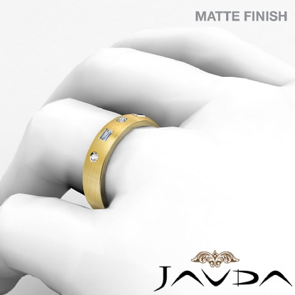 Modern matte finish baguette round diamond men's half wedding band is crafted in 14k Gold Yellow. Featuring matte finish low dome band with baguette and