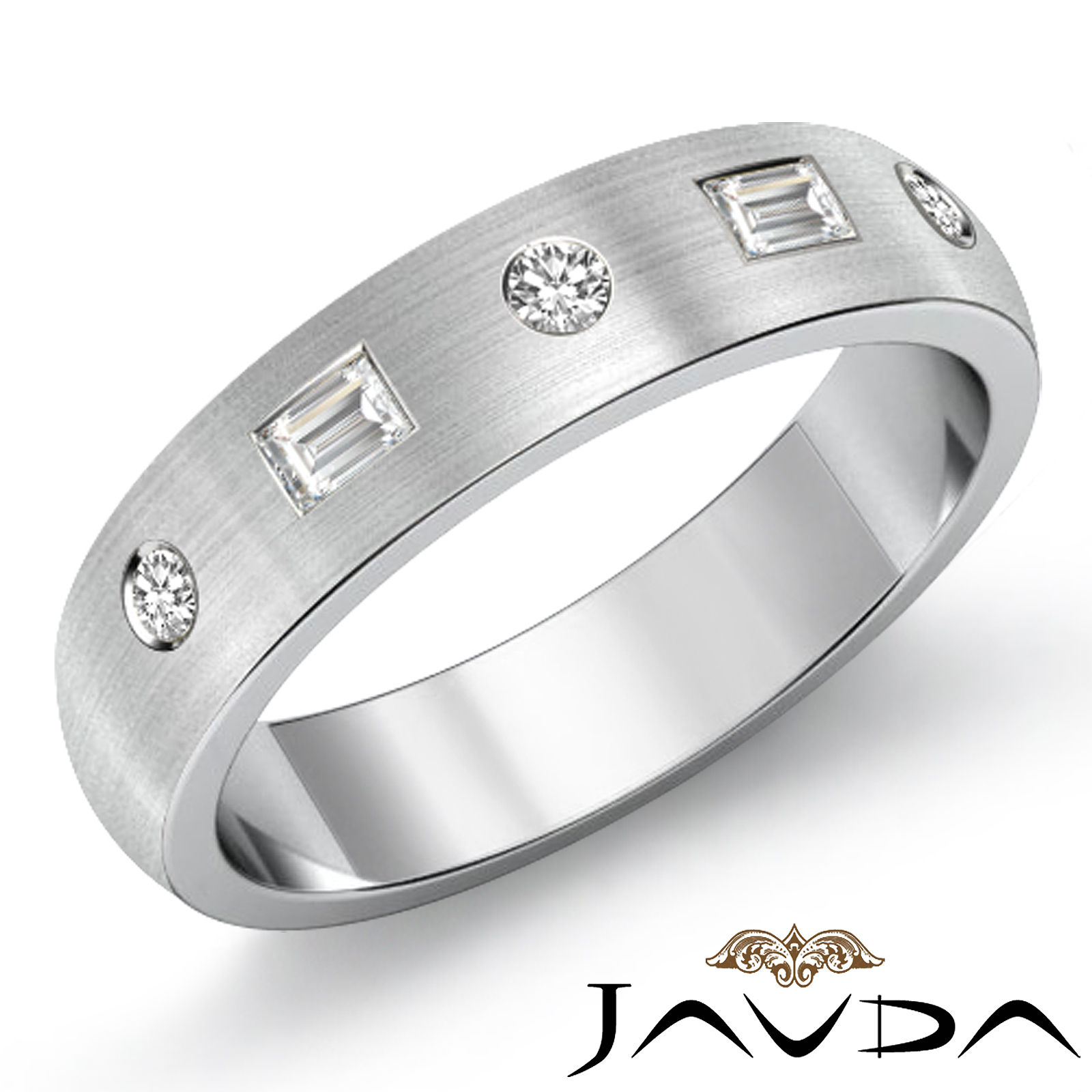 Modern matte finish baguette round diamond men's half wedding band is crafted in 18k Gold White. Featuring matte finish low dome band with baguette and