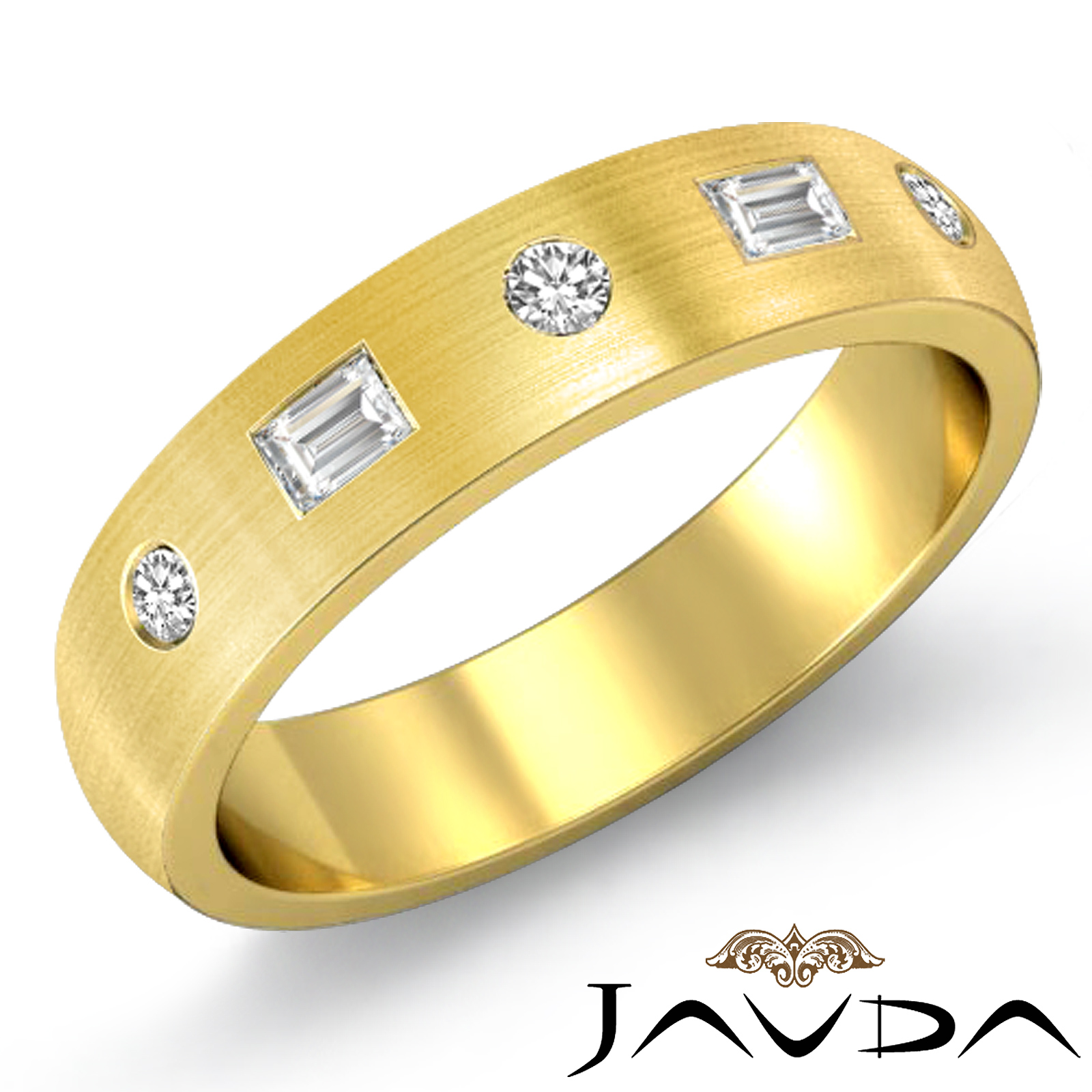 Modern matte finish baguette round diamond men's half wedding band is crafted in 18k Gold Yellow. Featuring matte finish low dome band with baguette and