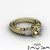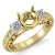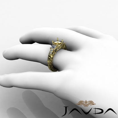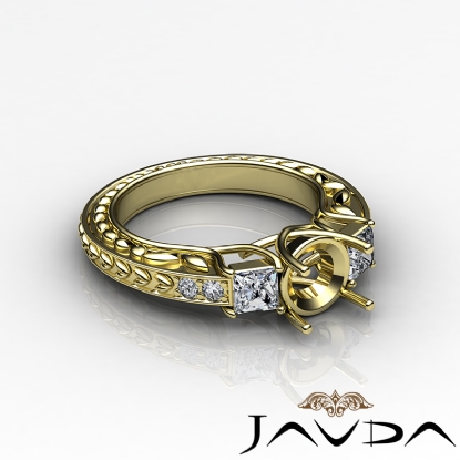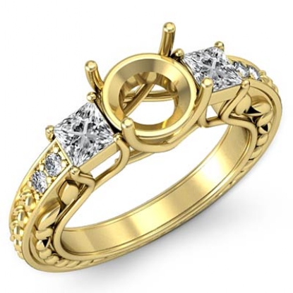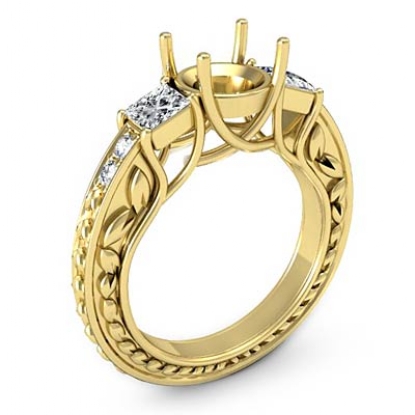 Delicately set round diamond semi mount and princess cut side stones in prong setting, this three stone ring looks ecstatic. Smaller round diamonds and leaf motifs highlight the ring. This ring is made in 14k Gold Yellow. (0.4Ct. tw.)