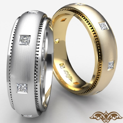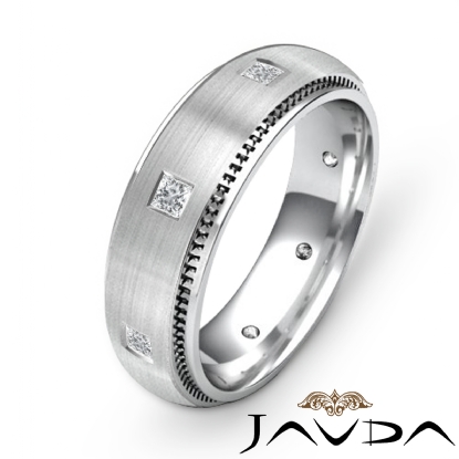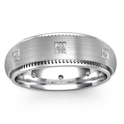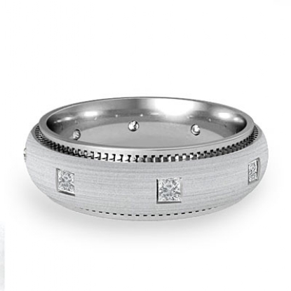 diamond eternity men's wedding band made from 18k Gold White. This ring features matte finish center and milgrain edges with princess cut diamonds set in a bezel setting. (0.4Ct. tw.)