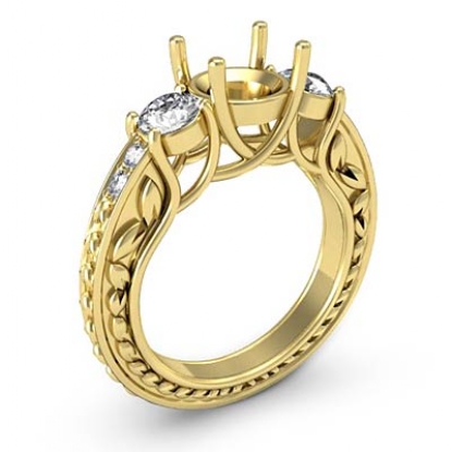 Beautifully set round diamonds in prong setting in this semi mount three stone diamond ring look ecstatic. Smaller round diamonds and leaf motifs that highlight the ring look unique. This ring is made in 18k Gold Yellow. (0.45Ct. tw.)