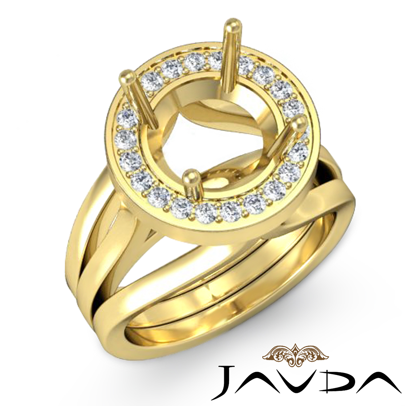An elegant statement, this multi split-shank diamond engagement ring captures all the romance with pave set diamonds on the semi mount halo, & is made in glorious 14k Gold Yellow. (0.4Ct. tw.)