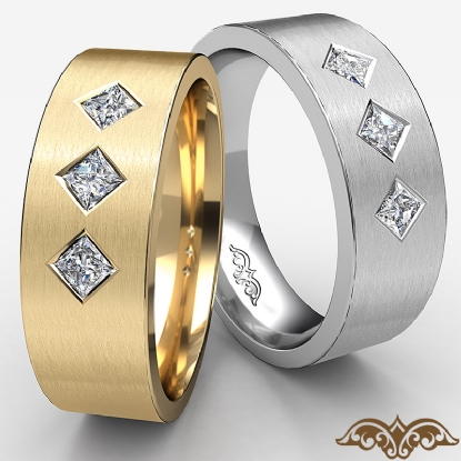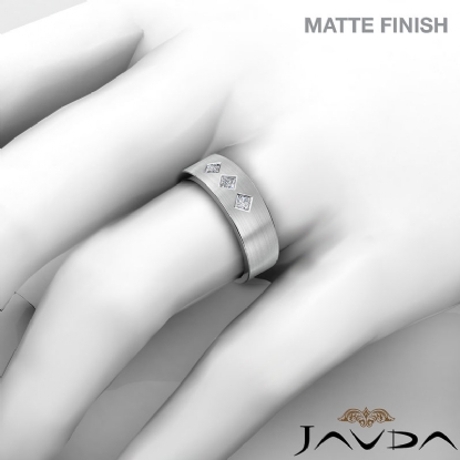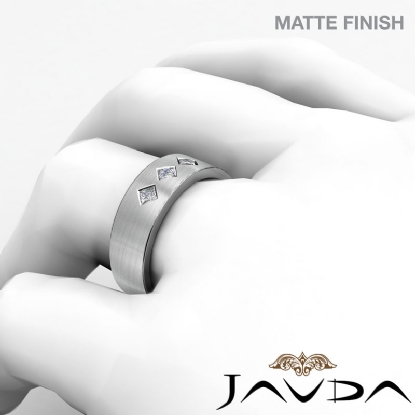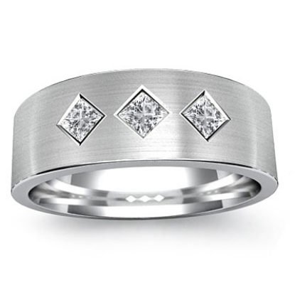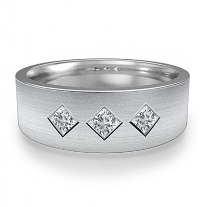 Modern kite set men's matte finish 3 stone princess diamond half wedding band is made from solid 14k white gold. Featuring matte finished flat band and 0.45 carat bezel set three princess diamonds beautifully set in a kite style for a classy look.