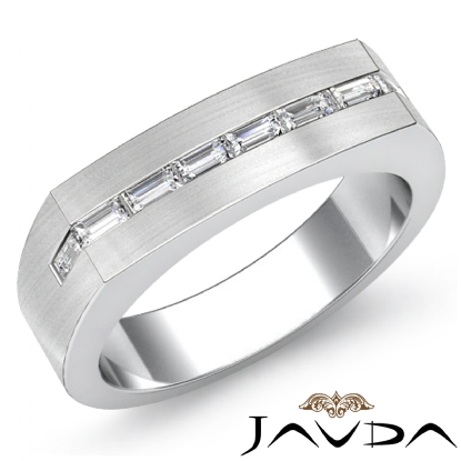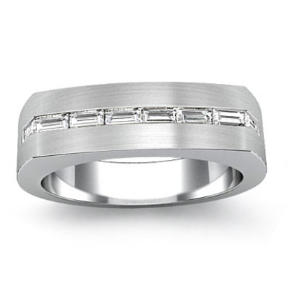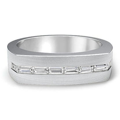 Euro style baguette diamond men's half wedding band is made from solid 14k white gold. Featuring matte finish euro style shank with center 0.50 carat baguette diamond set in a channel setting.