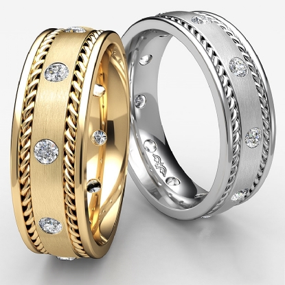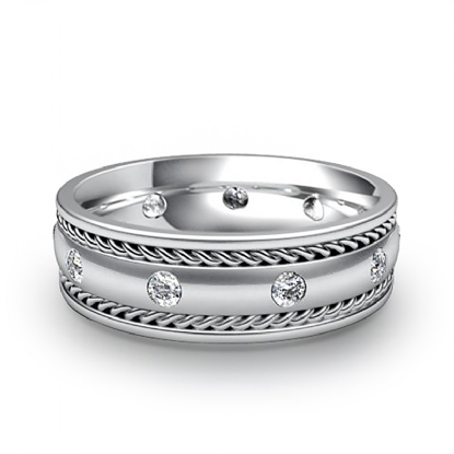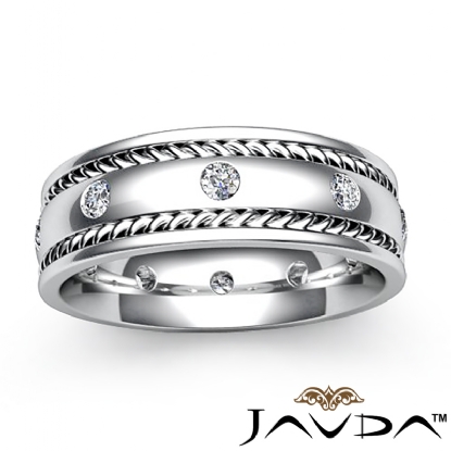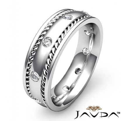 An elegant and stylish rope edge men's diamond eternity wedding band is made from 14k white gold. This ring features polished finish rope edge and center dome with 0.50 carat round diamonds in a bezel setting, rope detailing gives it a stylish look.
