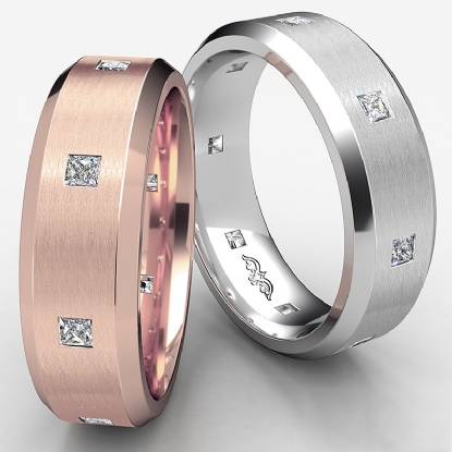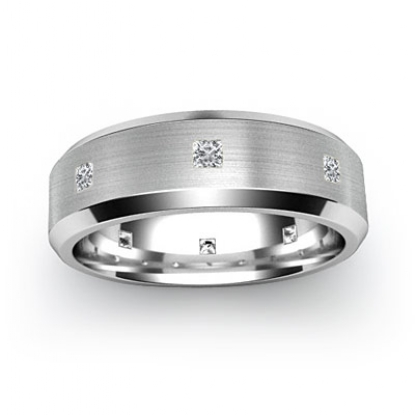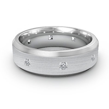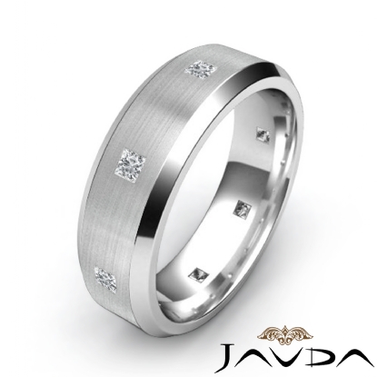 Handsome mens diamond eternity wedding band made from 18k Gold White. This ring features brushed finish center and polished beveled edges with total princess cut diamonds set in a bezel setting.