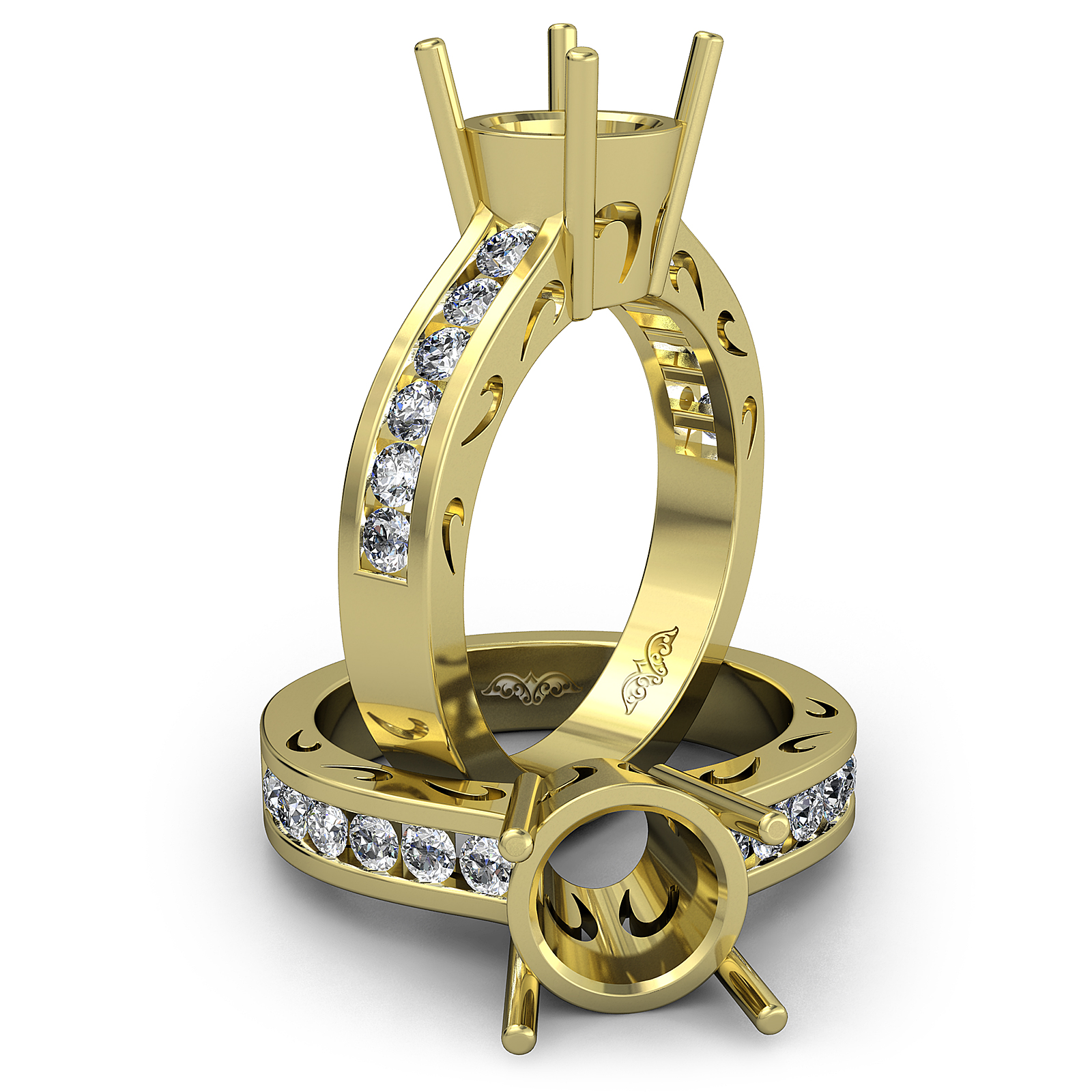 Graceful in design, this diamond engagement ring is made in 14k Gold Yellow. It showcases a round semi mount in prong setting, with smaller round diamonds in channel setting along the shank. (0.5Ct. tw.)
