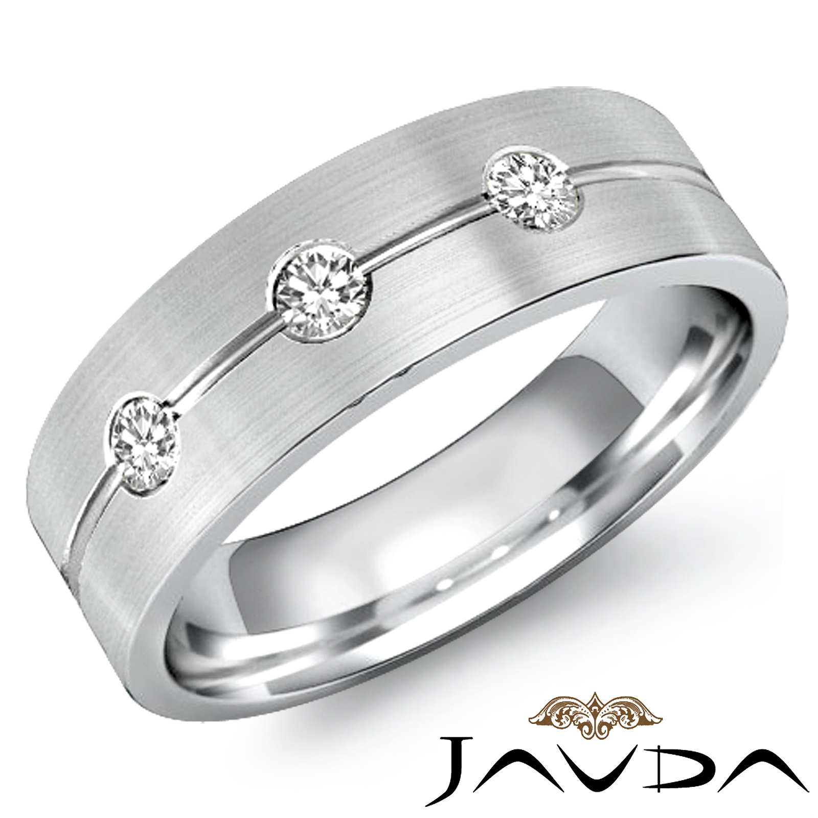 The elegant matte finished grooved 3 stone round diamond men's half wedding band is made from 14k white gold. Showcasing matte finished with 0.51 carat three round bezel set diamonds beautifully set on grooved.