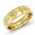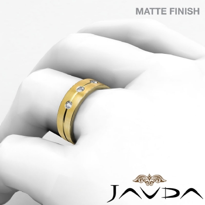 The elegant matte finished grooved 3 stone round diamond men's half wedding band is made from 14k Gold Yellow. Showcasing matte finished with three round bezel set diamonds beautifully set on grooved.