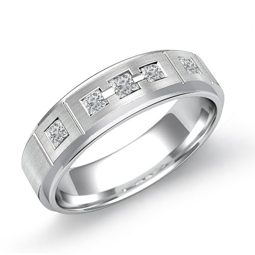 Delicate grooved 5 stone diamond men's half wedding band is made from solid 18k Gold White. This wedding ring features polished step edges and matte finished center with vertical grooves and princess cut 5 stone diamonds in a bezel set.