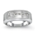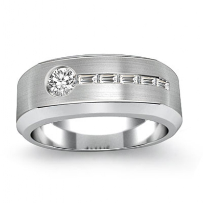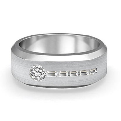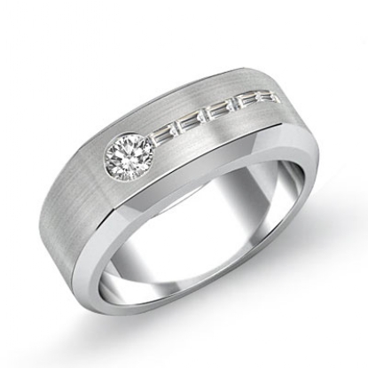 Exquisite diamond men's half wedding band is made from quality 14k white gold. This wedding ring features polished beveled edge and matte finish center with 0.20 carat round diamond in a bezel set and 0.25 carat baguette in channel set.