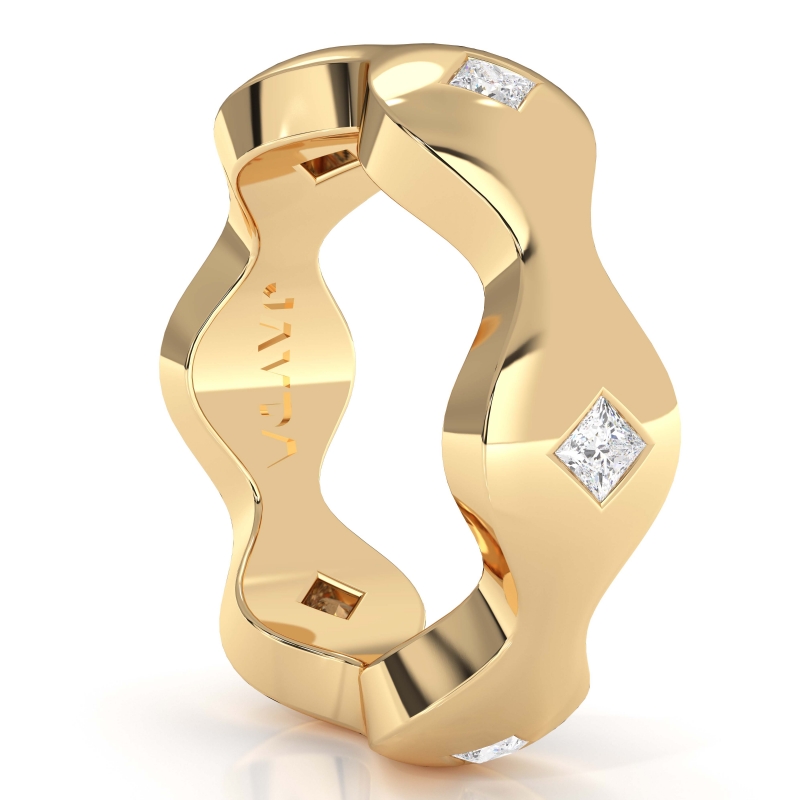 The unique and stylish wave design princess diamond men's eternity wedding band is crafted in 14k Gold Yellow. Featuring this wedding ring polished finish wave design band with princess cut diamonds set in a bezel setting.