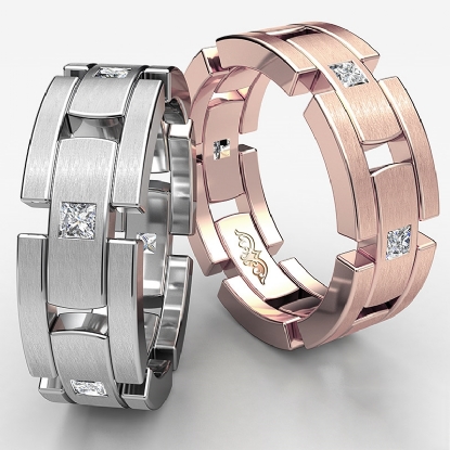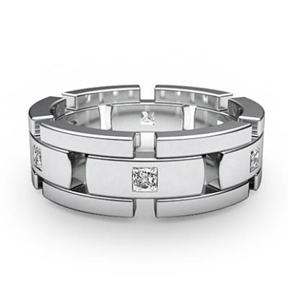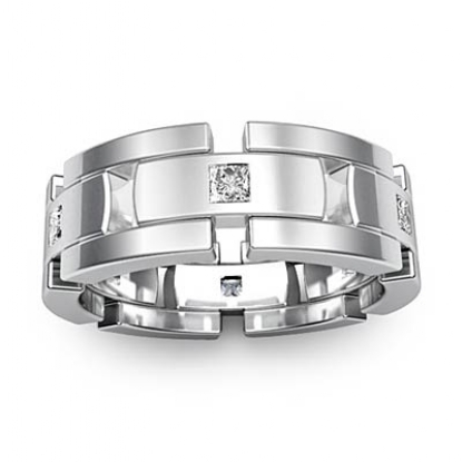 The timeless block link princess diamond men's eternity wedding band is made from precious metal Platinum 950. This handsome wedding ring features polished block link style with princess diamonds in a bezel setting.
