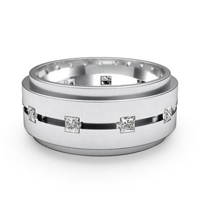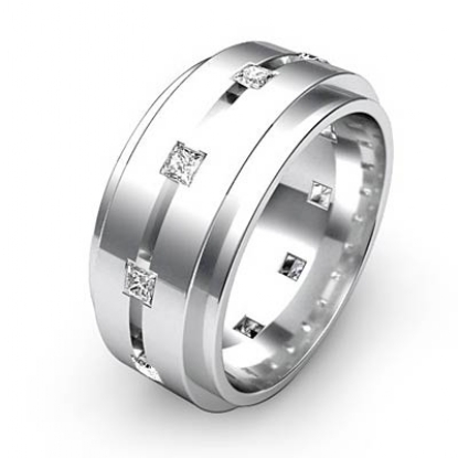 This timeless classic style polished finish princess diamond eternity men's wedding band is made from 14k white gold. Featuring polished finished step edge and center horizontal grooved with 0.70 carat princess diamonds in a bezel setting.