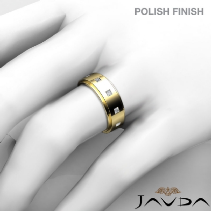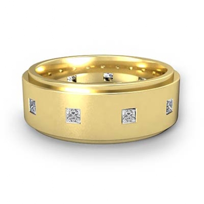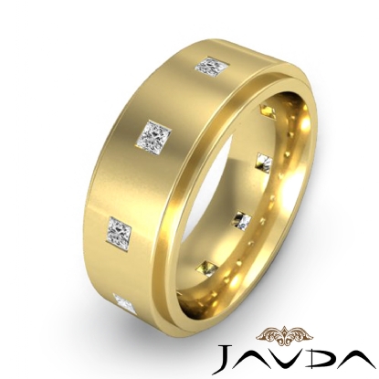 Fashionable & affordable polished finish princess diamond eternity men's wedding band is made from solid 14k Gold Yellow. Showcasing polished finished step edge with princess diamonds in a bezel setting.