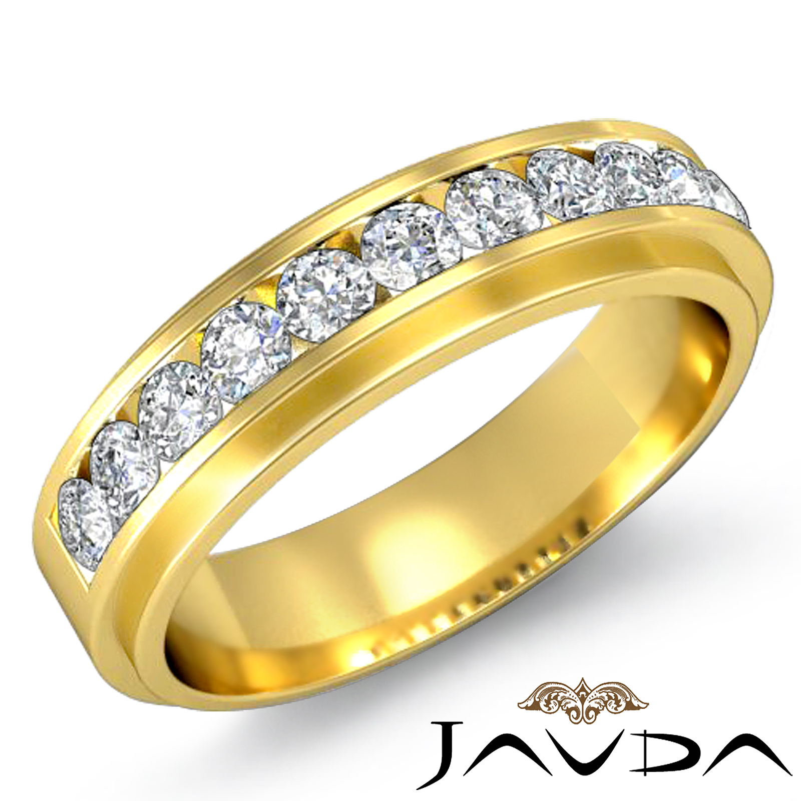 This stunning men's channel set diamond half wedding band is made from quality 18k Gold Yellow. Showcasing polished finish step edge with round diamond set in a channel setting.
