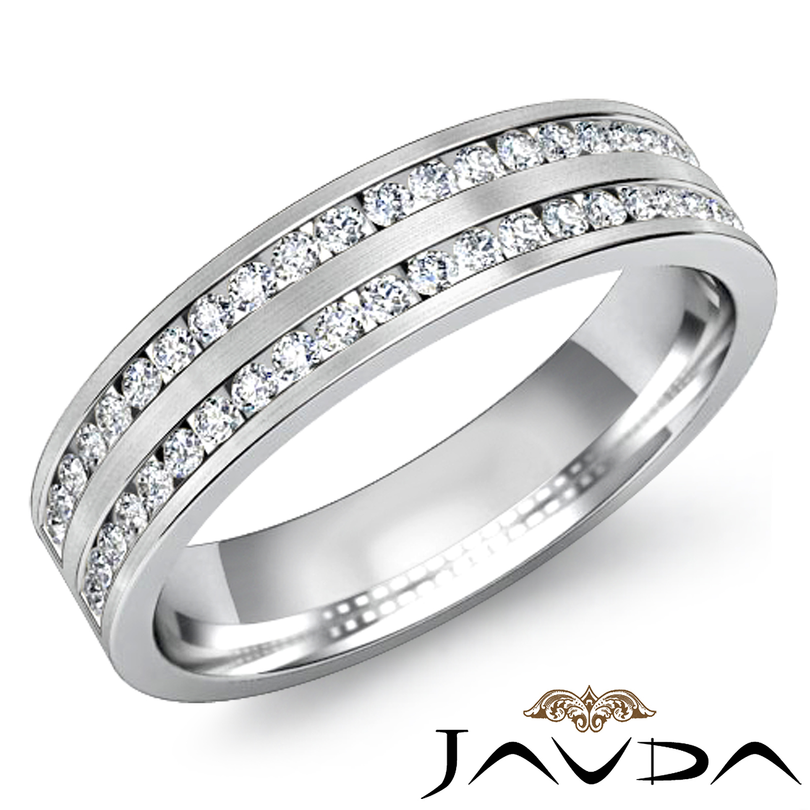 A glittering round channel diamond men's half wedding band is crafted in Platinum 950. The band is made in the comfort fit style and features matte finish with round diamonds in a channel setting.
