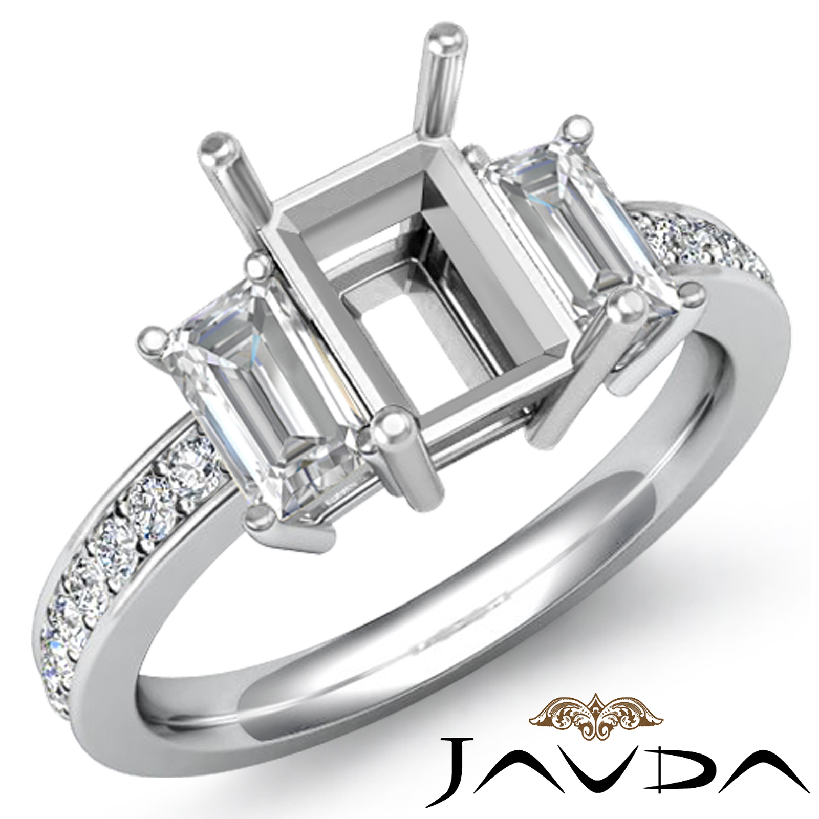 Brighten an emerald-cut semi mount with two 0.50ct. emerald side stones in prong setting and 0.35ct. pave set round diamonds on the shank. Made in enduring 14K white gold, this three stone diamond ring will definitely stand out!