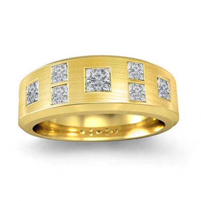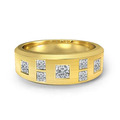 An elegant and stylish unique matte finished princess diamond men's half wedding band is made from solid 18k Gold Yellow. Showcasing matte finish center with total 7 princess diamonds set in a bezel setting.