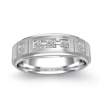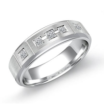 Delicate grooved 5 stone diamond men's half wedding band is made from solid 14k white gold. This wedding ring features polished step edges and matte finished center with vertical grooves and 0.55 carat princess cut 5 stone diamonds in a bezel set.