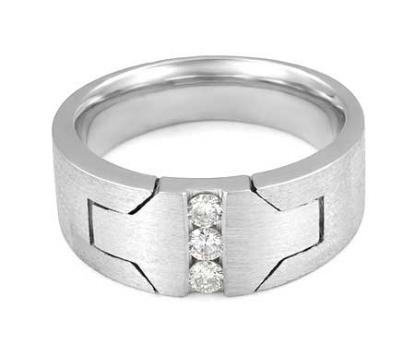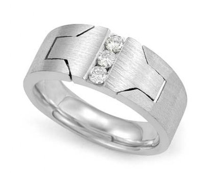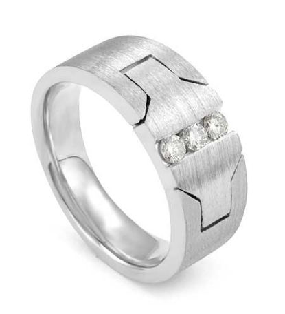Unique design 3 stone matte finish men's diamond half wedding band is made from precious 14k white gold. Featuring matte finished band with unique cuts and 0.25 carat round diamonds set in a channel setting.