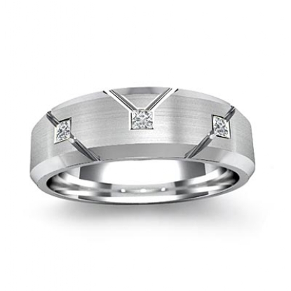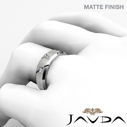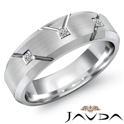 The designer handsome diamond men's half wedding band is made from solid 14k white gold. Featuring matte finish center with 0.20 carat 3 princess cut diamond set with diagonal strikes pattern throughout the band in an exquisite manner.