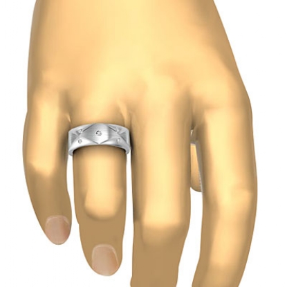 A timeless design diamond pattern men's half wedding band is crafted in 14k white gold. Featuring the combination of matte and polished finish center with 0.20 carat round diamonds set in a bezel setting.