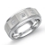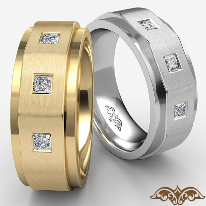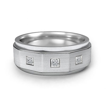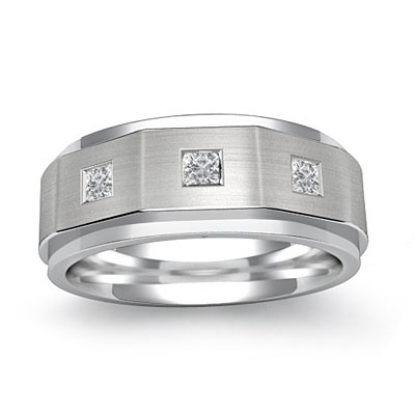 Elegant matte finish diamond men's half wedding band is made from solid 14k white gold. This ring features polished step edge and matte finished center with 0.20 carat 3 stone princess cut diamonds in a bezel set.