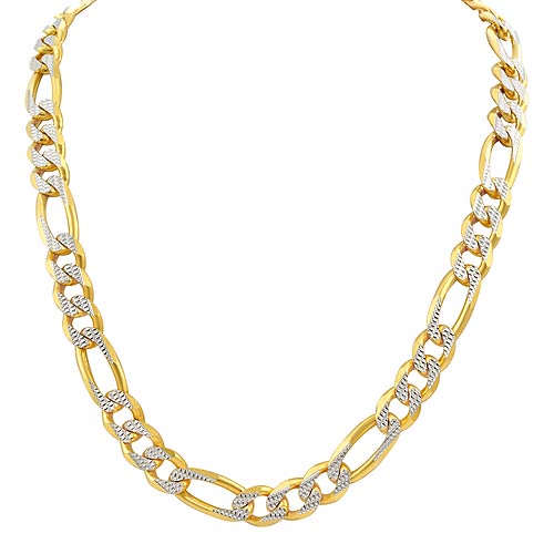 This 14k 2Tone Gold Men's Solid Figaro Chain weight is 142.60gram. Length of Chain is 26" and width is 11.60mm [milimeter].