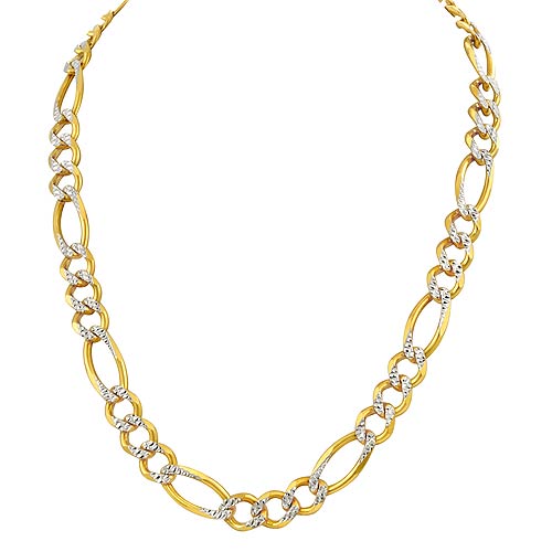 This 14k 2Tone Gold Men's Solid Figaro Chain weight is 62.30gram. Length of Chain is 26" and width is 9.50mm [milimeter].