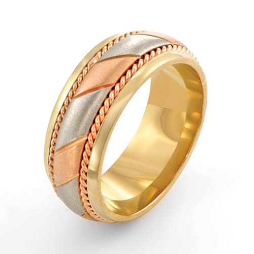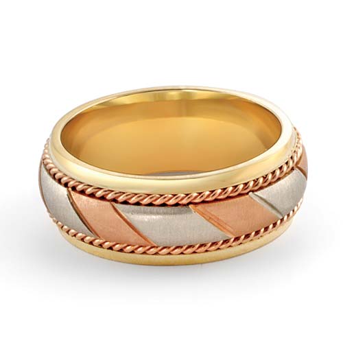 14 karat tri color GOLD 8mm wedding band with yellow gold edges, rose gold rope design and white and rose gold diagonal strips.
