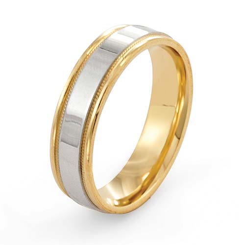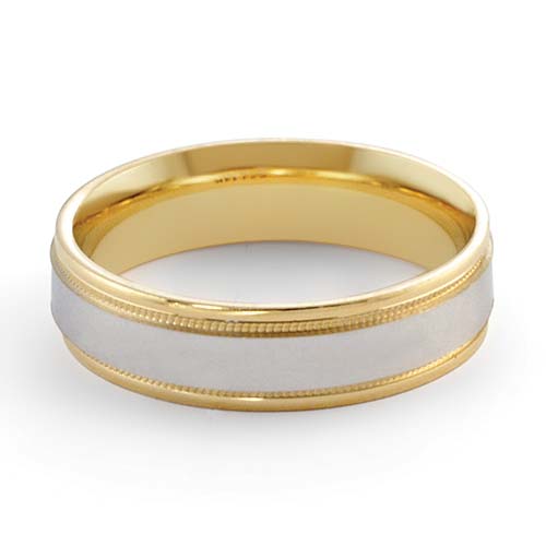14 karat yellow and white GOLD 6mm wedding band with thick white center and diamond cut design.