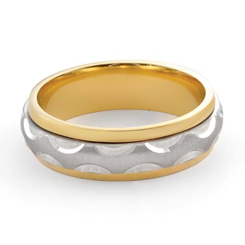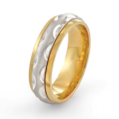 14 karat yellow and white GOLD 6mm wedding band with white center, half circle imprint design.