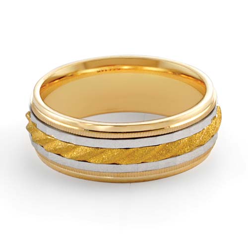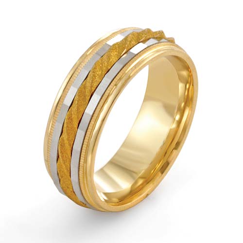 14 karat white and yellow GOLD 7mm wedding band with comfort fit. Band has yellow braided design and white strip detail.