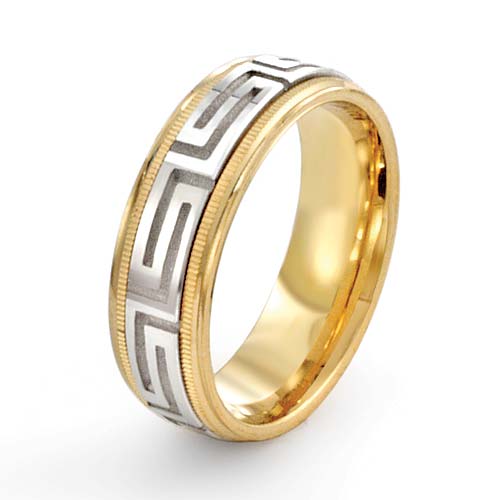 14 karat yellow and white GOLD 6.35mm wedding band with maze center design.